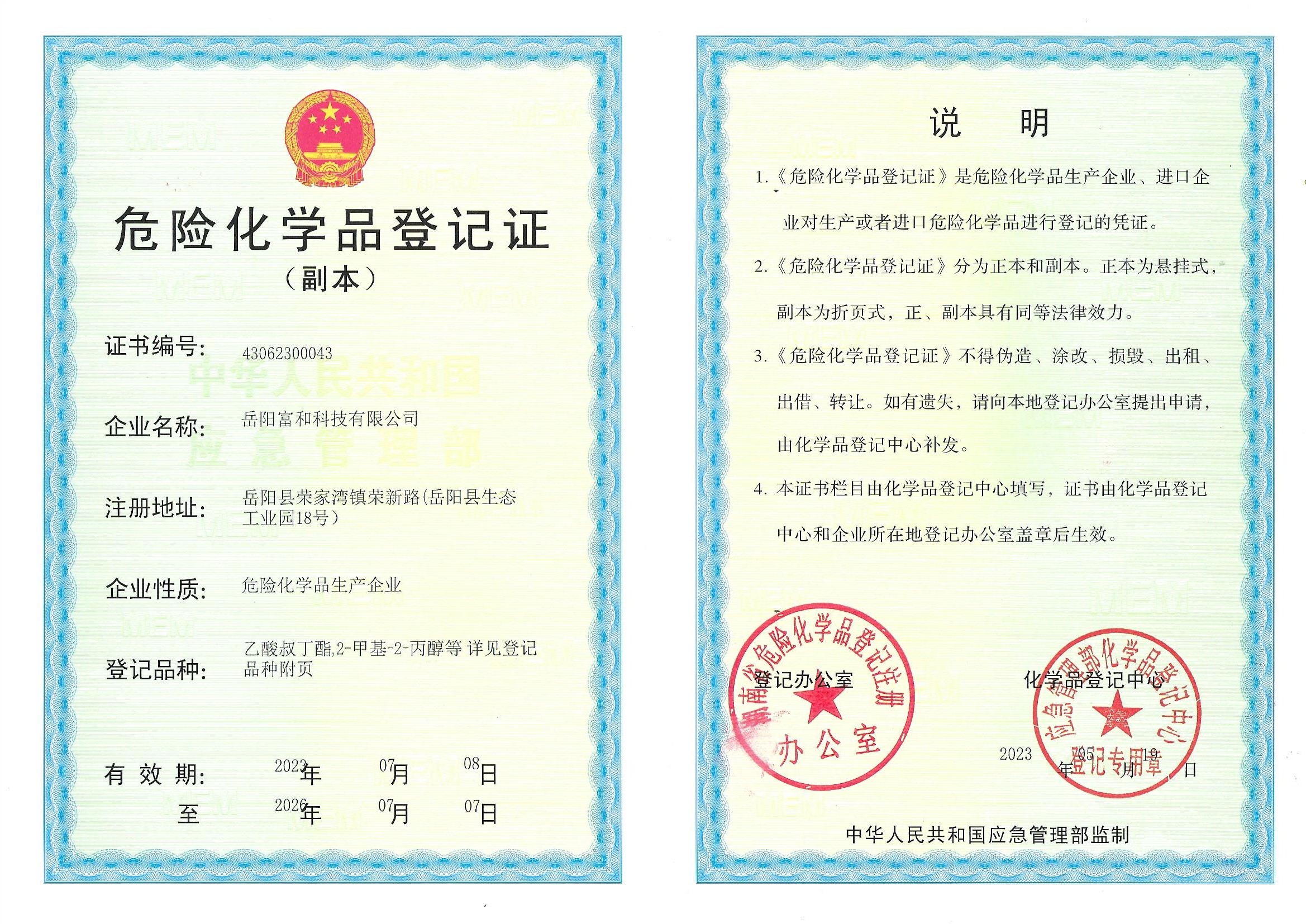 危險(xiǎn)化學(xué)品登記證副本